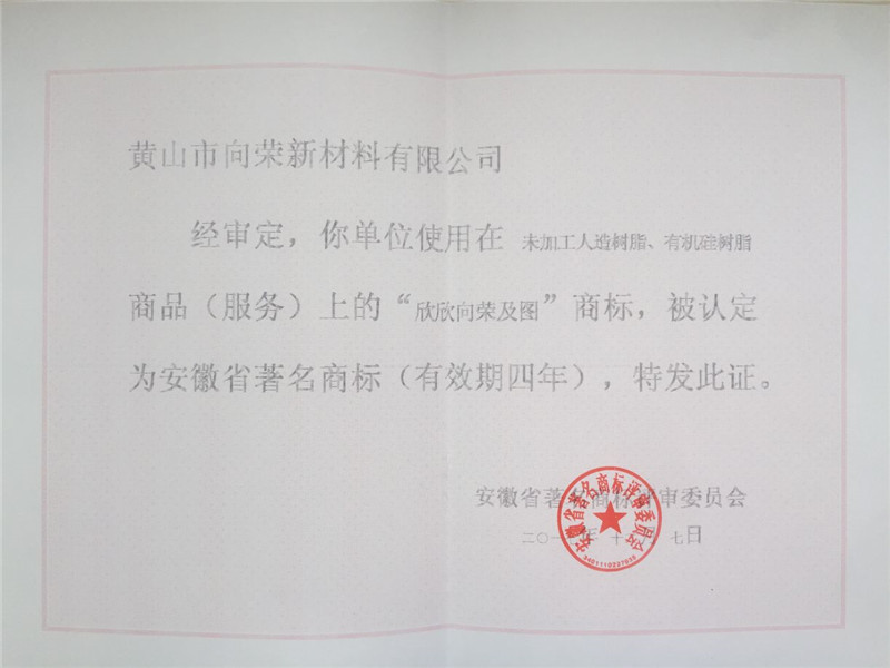 恭贺:黄山市向荣新材料有限公司荣获“2017年度安徽省著名商标”